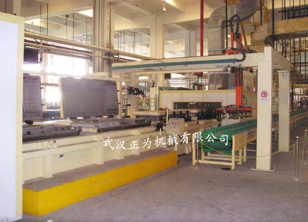 The refrigerator door foaming production line adopts double chain wheel horizontal movement lifting transmission structure. It is composed of frame, transmission device, mould carrier, oven, mold opening and closing manipulator, picking up sucker trolley and electric control system. The number of stations in the production line can be designed according to customer requirements.